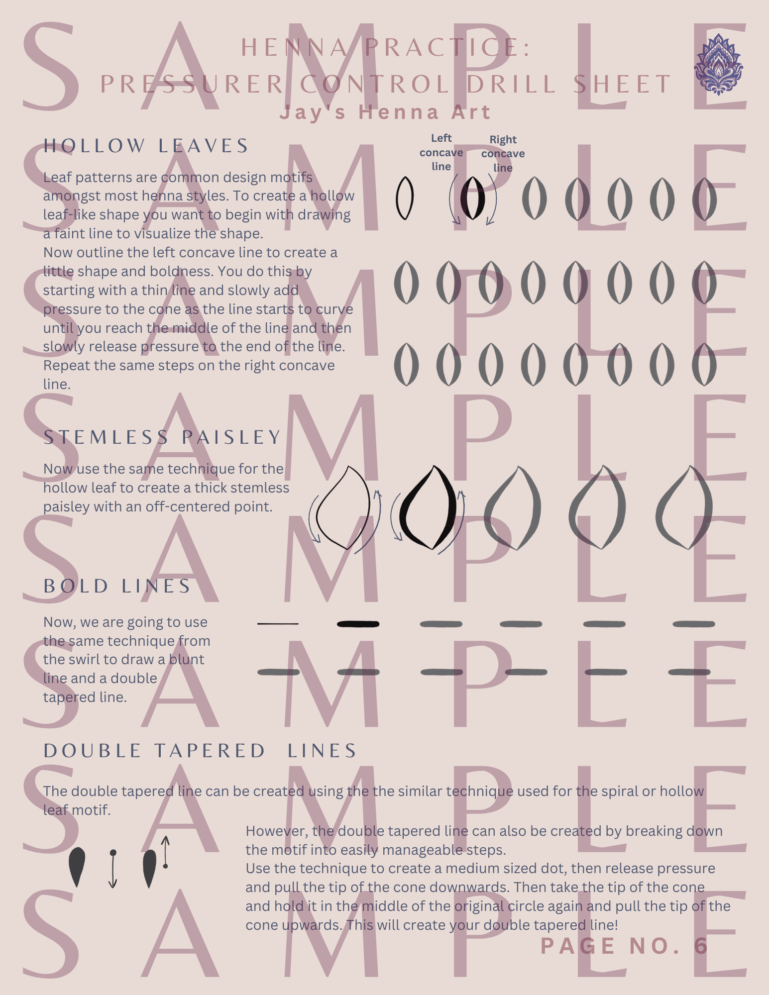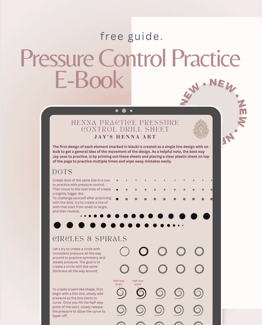 Pressure Control is a key skill to have to enhance your henna designs from a beginner to an intermediate henna artists! This FREE document gives you important tips and tricks to help enhance your pressure control!